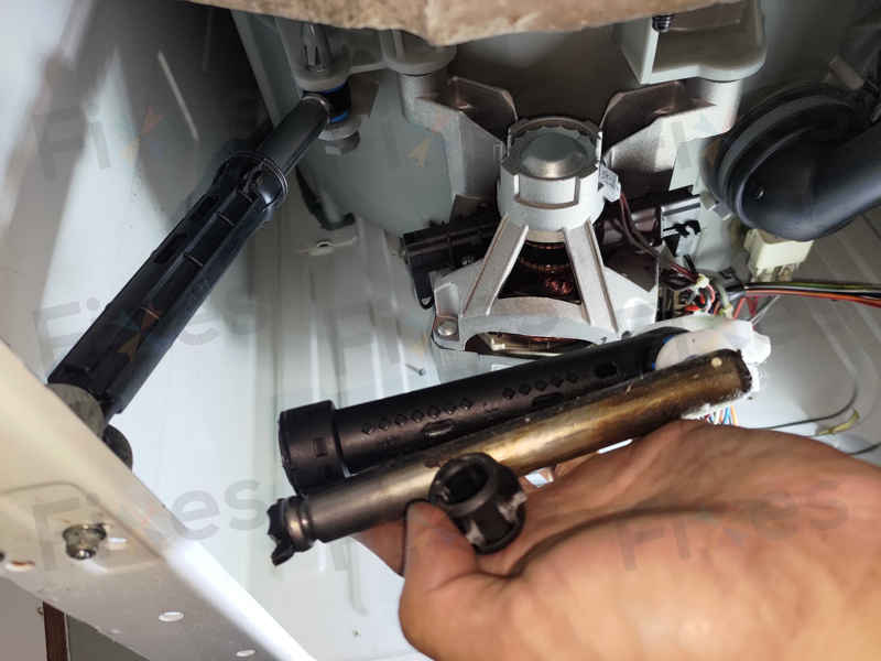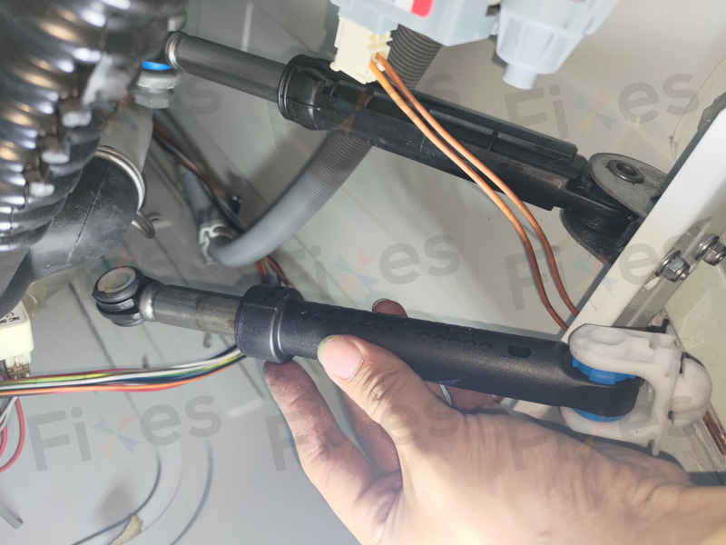 兵團師傅上門後,詳細測試了洗衣機軸芯,沒有發現軸芯問題。進一步檢查機底結構,發現避震裝置出了狀況。更仔細一看,原來有一支避震器已經斷裂,變成一根沒有作用的棍子。這就像一張失去彈性的彈簧床,怎麼睡都不舒服,洗衣機當然也無法穩定運行。