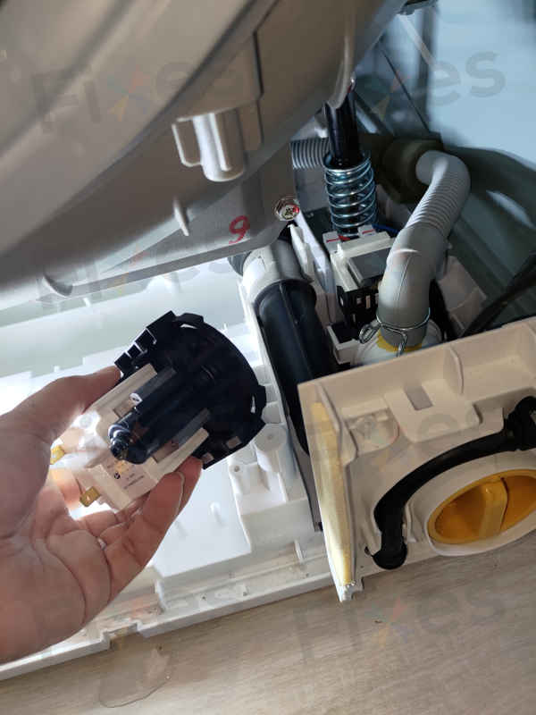 拆除前板後,師傅終於能夠接觸到位於機身右側的排水泵。他熟練地拆下舊的排水泵,安裝上新的排水泵。安裝完成後,師傅仔細地將前板和電子板重新安裝好,確保每個部件都固定到位。