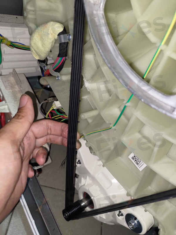 兵團師傅進一步拆開背板檢查,發現皮帶已經出現嚴重磨損,表面有明顯的劈裂痕跡。皮帶損壞會影響平衡感應器的正常運作,導致洗衣機無法進入高速脫水模式。更換新的皮帶後,洗衣機立即恢復正常運作,可以順利進行高速脫水。